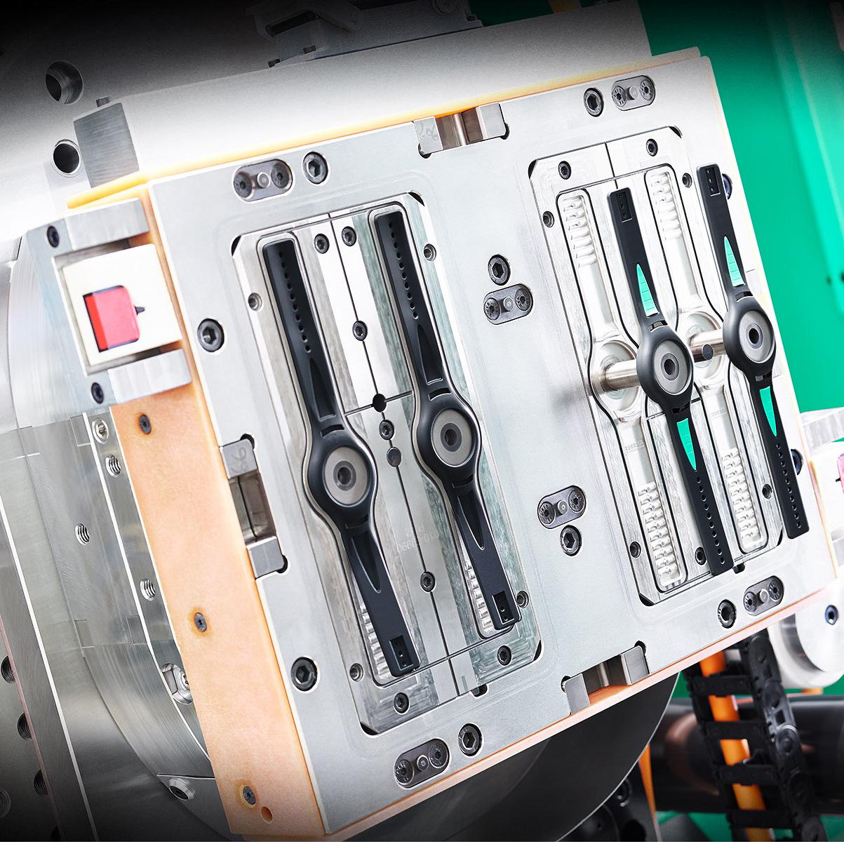 雙色表帶注射成型通過模具合模后先注射單邊顏色完成注塑成型后,將模芯替換在進(jìn)行二次注射成型達(dá)到雙色效果,同時達(dá)到完全不分色不分線的效果。